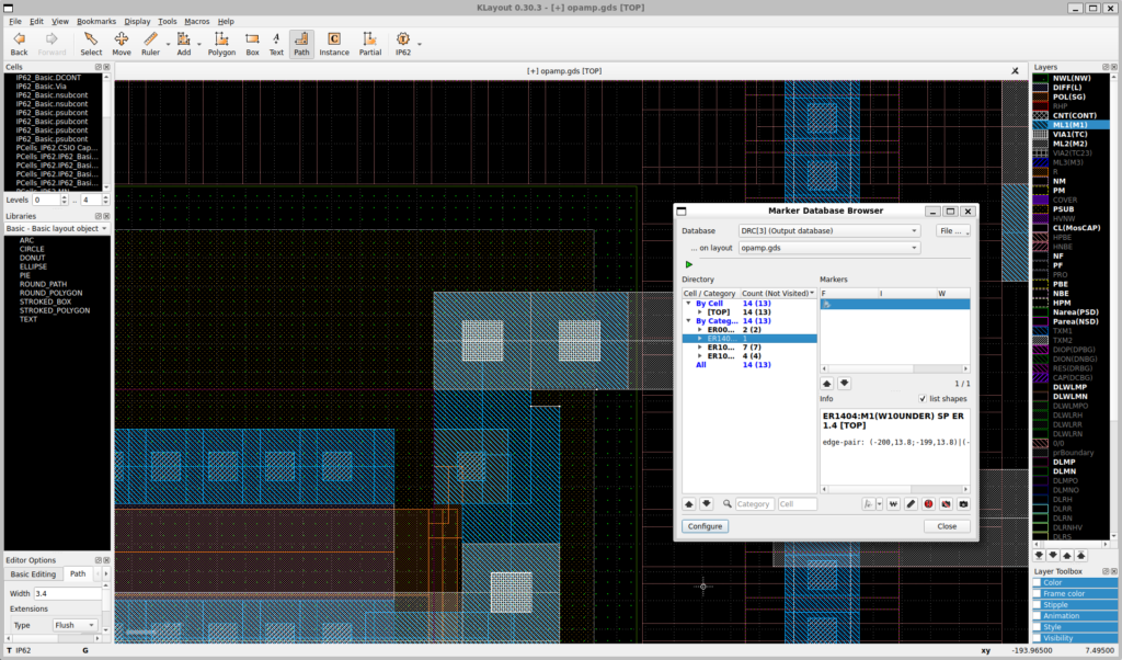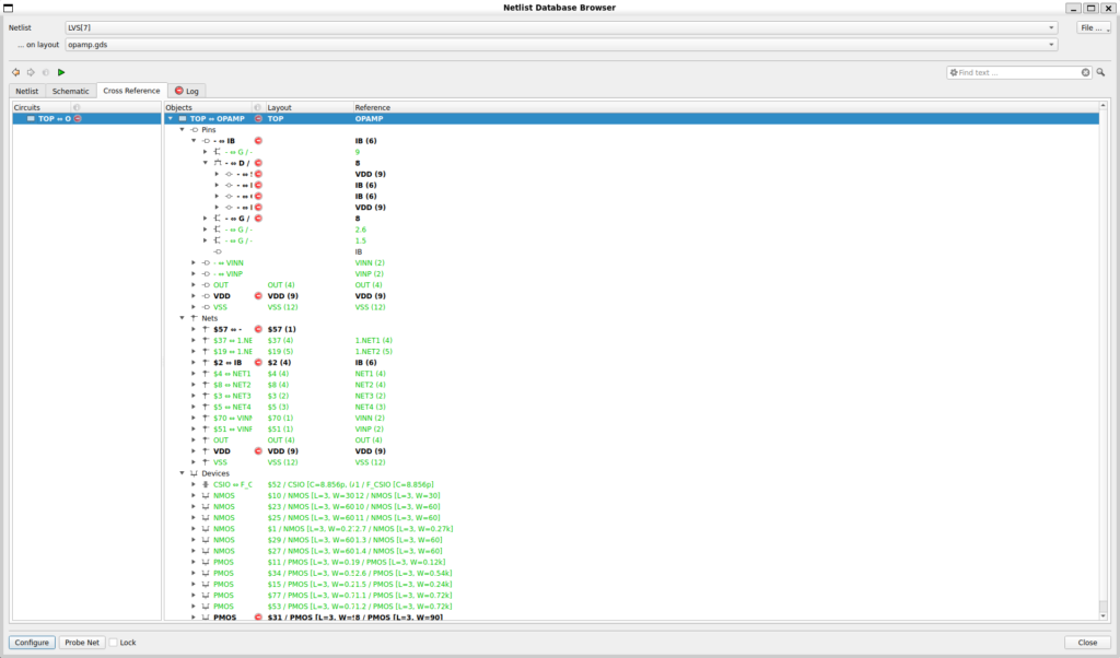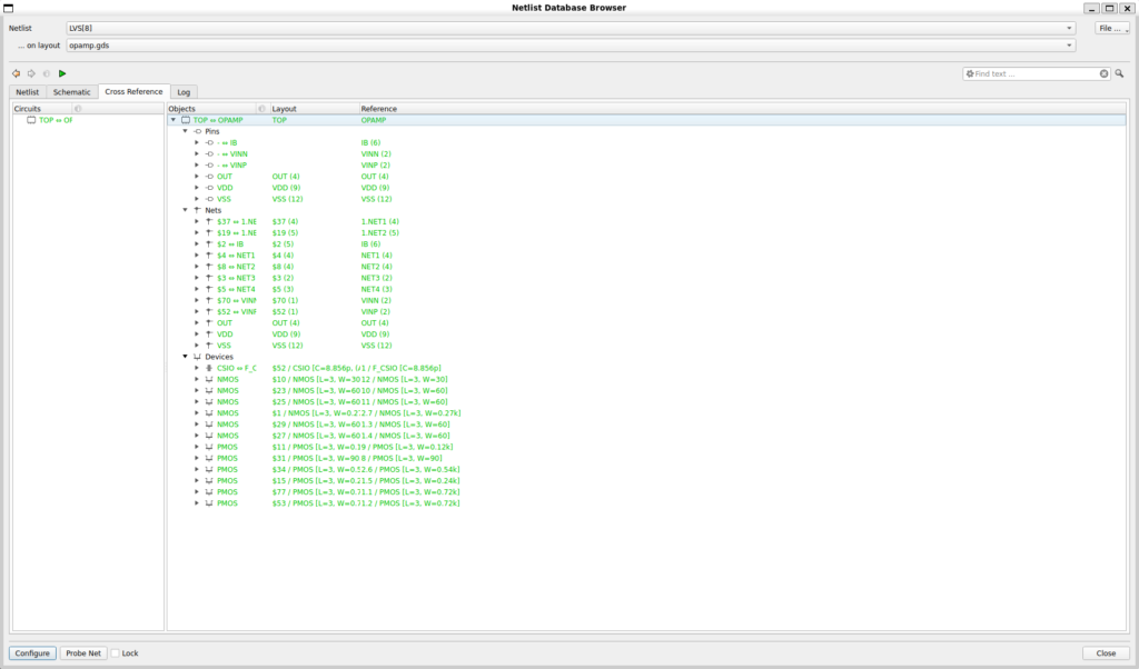 図5はDRCチェックが完了した後の、図1でいうM8付近の拡大図です。この状態で、引き続きLVS(Layout Versus Schematic)を検証します。ここでは、作成したレイアウトと回路図が一致しているかをチェックします。