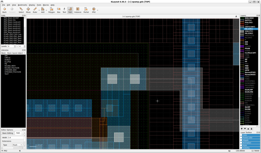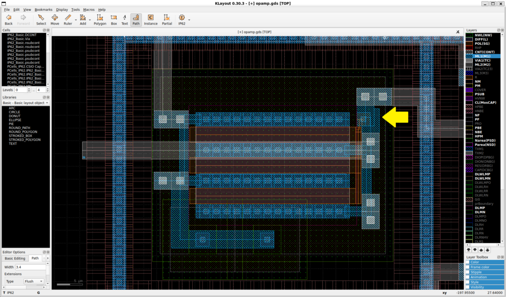 今回は最大で600um×200umに収めるように指定されていました。完成したレイアウトは以下のとおりで、ギリギリ範囲内に収めることができました。