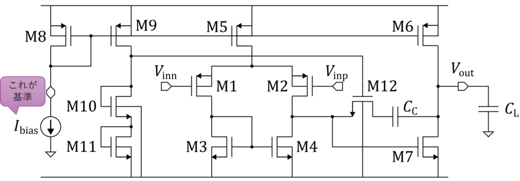 各種パラメータを決定したら、klayoutを使って指定されたサイズ内でパーツを配置・配線していきます。実装する回路は図1のとおりです(『OPAMP設計(TR10)』より引用)。つまり、図2のVoutよりも左側にある12個のトランジスタと1個のキャパシタを配置する必要があります。