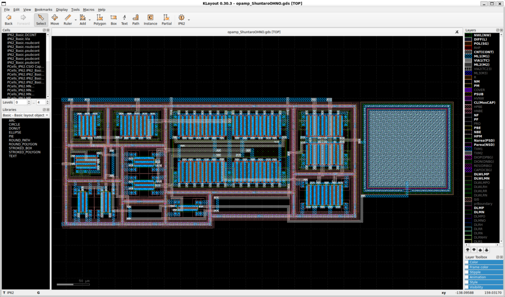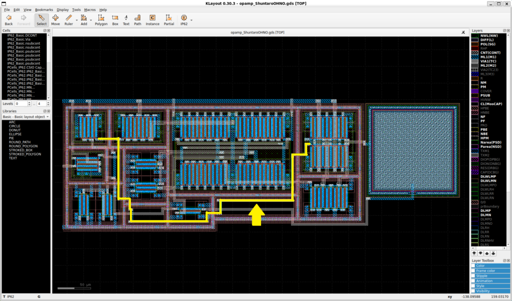 このイベントでは、半導体としてのアナログ回路設計について、二段差動増幅オペアンプを通して学びました。2日間のハンズオンとその後の1週間の宿題期間で作成したレイアウトは、相乗りチップとして製造予定です。相乗りチップとは、1つの半導体チップのスペースやピンを複数人で共有し、1人あたりの製作費用を抑える試みです。詳細はイベントページやISHI会のホームページを参照してください。