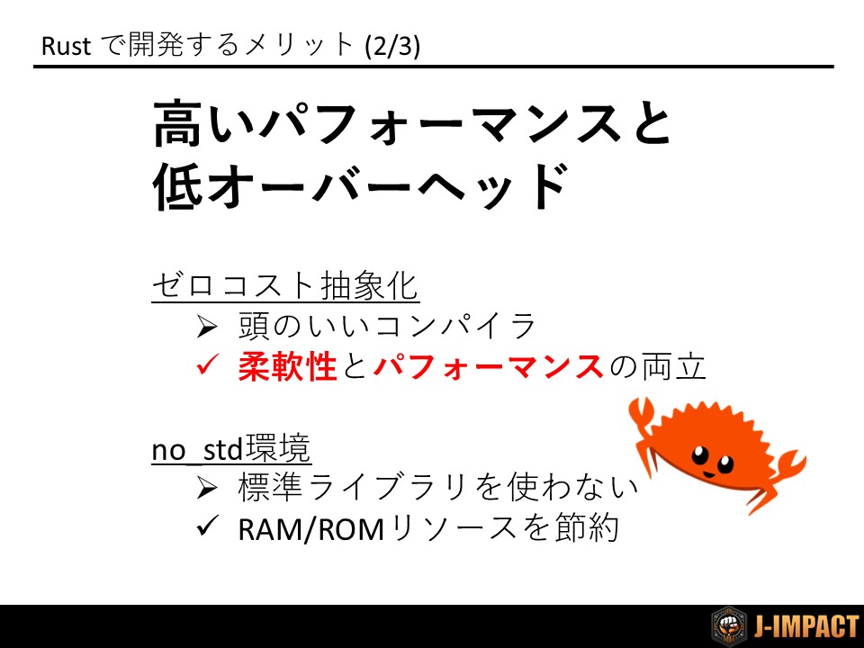 また、OSを使用しない組込み開発ではno_std環境を使用することで、標準ライブラリ(std)に依存しない開発を可能とし、マイコンのRAMやROMのリソースを削減できます。