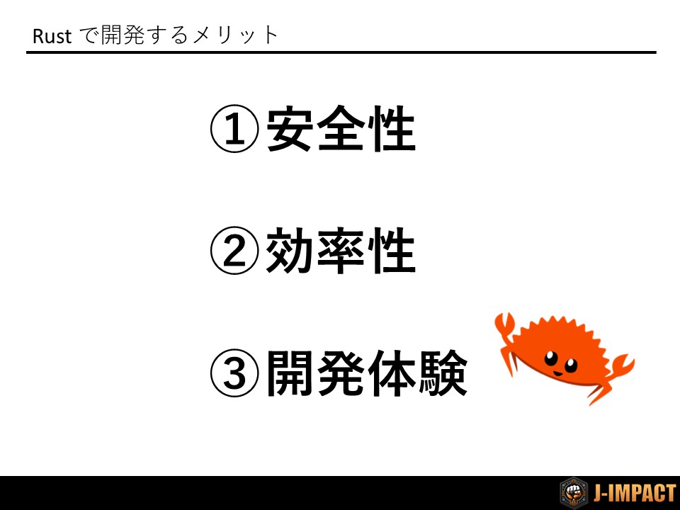 以上から、開発者の能力に依存せず、システムとして脆弱性を作りにくいRustを採用することが、今後ますます求められるようになるでしょう。