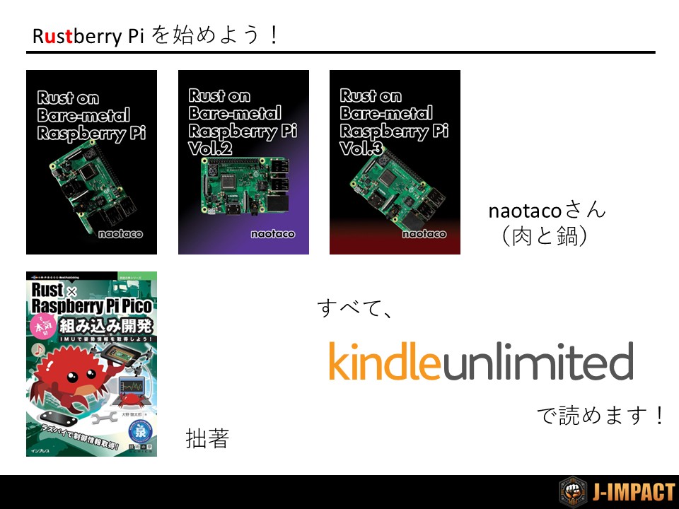 これらの本はすべてkindle unlimitedで読めるため、購入前にコードが古くなっていないか確認するとよいでしょう(Rust×Raspberry Pi Pico本のコードが動かなくなっていた場合には、@doraneko_b1fまで連絡ください)。Rustの組込み開発コミュニティが活発である影響で、ライブラリのアップデートが頻繁に行われた結果、過去のコードが動かなくなる場合があります。