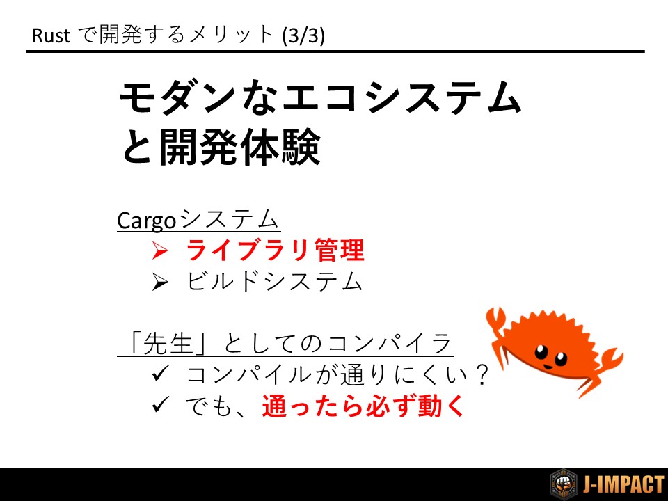 また、「Rustは学習コストが高く、コンパイルできるコードを書くのが一苦労」という評判も散見されます。しかしこれは、「Rustで一度コンパイルが通ってしまえば、謎の脆弱性で途中終了することはない」というメリットの裏返しです。コンパイル失敗時には丁寧なエラーメッセージが表示されるので、これに従って開発を進めることでRustを学習することができます。