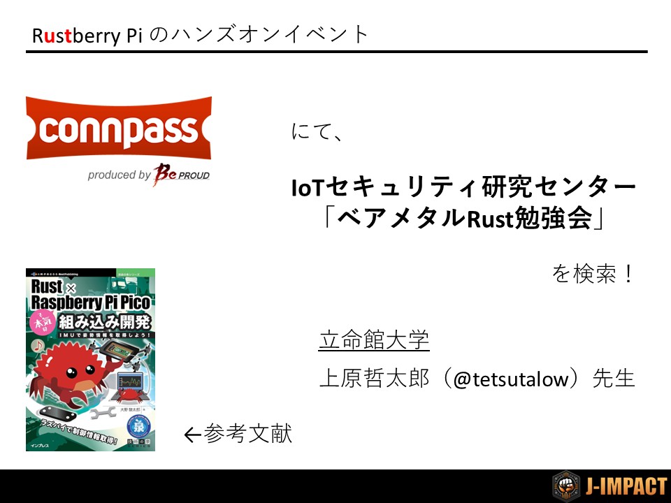 上原哲太郎先生をはじめとした、立命館大学・IoTセキュリティ研究センターの方々が、ベアメタルRust研究会を開催されています。内容はRustでRaspberry Pi PicoやRaspberry Pi Pico Wを操作するための入門編なので、開発をはじめてみたい方におすすめです。